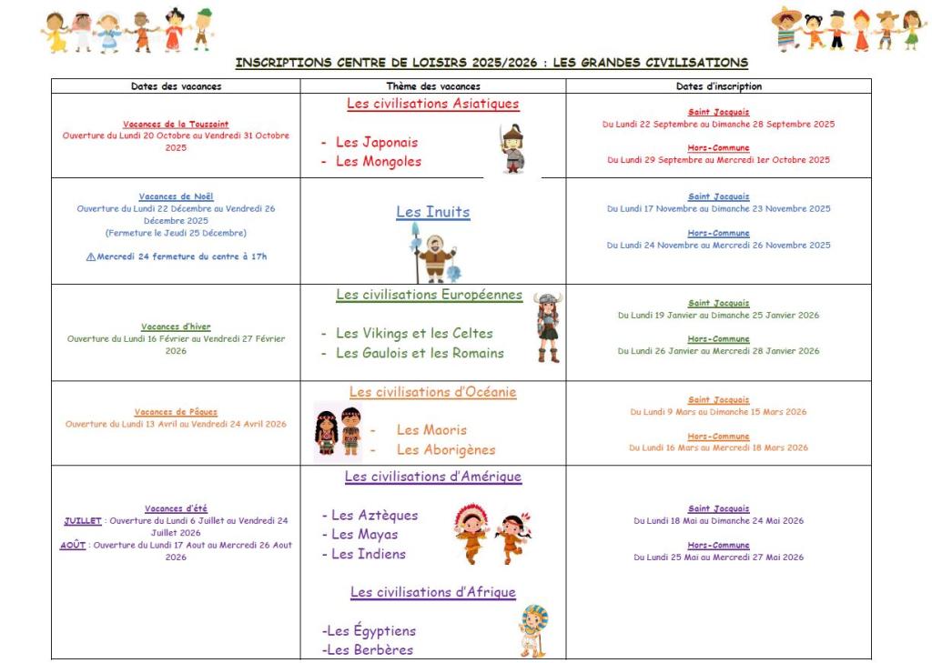 Pendant les vacances, les enfants découvriront le thème "Les grandes civilisations" ; des jeux et activités manuelles, des activités sportives, des sorties leur seront proposés par rapport aux sagas choisies par l'équipe d'animation.